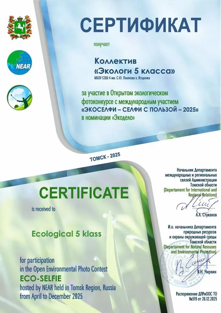 Обучающиеся 5 класса с классным руководителем Троценко Т.В. приняли участие в Открытом экологическом фотоконкурсе с международным участием "Экоселфи - селфи с пользой -2025"