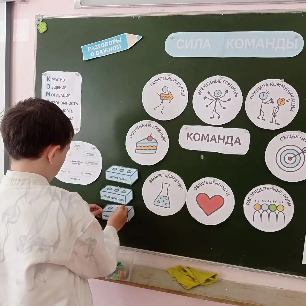В формате живого диалога старшеклассники приводили примеры из спорта (футбольные и баскетбольные команды), волонтёрских проектов и даже семейной жизни. Младшие школьники разбирали ситуации на примере подготовки спектакля, уборки класса или участия в эстафете. Итогом занятия стала простая, но важная мысль: команда — это не сумма умных людей. Команда — это доверие, уважение и умение радоваться общему успеху больше, чем личному.